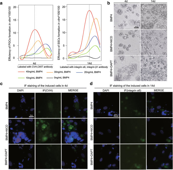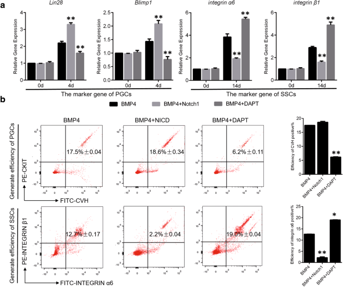 实验目的是在体外细胞模型中验证Notch信号对PGCs和SSCs的双向调控作用,排除体内微环境的干扰。方法细节为建立骨形态发生蛋白4(BMP4)诱导鸡ESCs向PGCs和SSCs分化的体外模型,优化BMP4的浓度(40ng/mL为最优浓度);在模型中分别过表达和抑制NICD,通过间接免疫荧光检测PGCs和SSCs的标记物表达,通过流式细胞术检测细胞形成效率。结果显示,体外模型中,过表达NICD显著促进PGCs的形成,抑制SSCs的形成;抑制NICD则相反,PGCs形成效率降低,SSCs形成效率升高,与体内实验结果一致,说明Notch信号的双向调控作用具有细胞自主性,不依赖体内复杂的微环境,对应图4、图5。