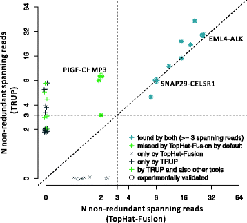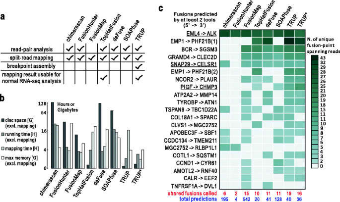 结果解读:TRUP在小细胞肺癌细胞系N417和H187中分别检测到CREBBP和TAF6L的失活融合,与领域内组蛋白修饰基因重排参与肿瘤发生的结论一致;工具对比显示,TRUP的计算资源消耗显著低于其他工具,即使采用GSNAP映射,其整体运行效率仍更优,且映射结果可直接用于常规RNA-seq分析(仅TRUP与TopHat-Fusion支持结果复用);以金标准评估,TRUP的召回率与精确率的调和均值为0.62,显著高于TopHat-Fusion的0.49,且能检测到其他工具遗漏的验证阳性融合(如PIGF-CHMP3),表明TRUP在灵敏度与特异性间实现了更优平衡。