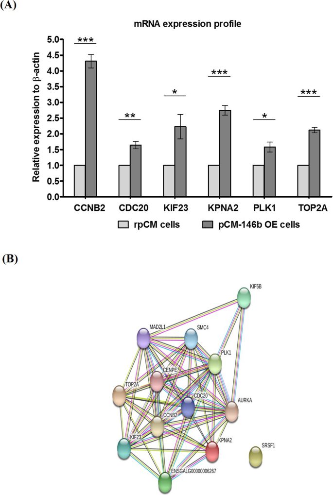 实验目的是从全基因组水平解析miR-146b-5p促进肌细胞增殖的分子通路。方法细节为:对rpCM和pCM-146b OE细胞进行RNA测序(RNA-seq),分析差异表达基因(DEGs);通过基因集富集分析(GSEA)筛选显著富集的通路;采用STRING分析差异基因的蛋白互作网络;利用实时荧光定量PCR验证细胞周期相关基因的表达。结果解读:RNA-seq共鉴定到647个差异表达基因,其中356个上调、291个下调;GSEA显示细胞周期相关基因集显著上调;STRING分析显示上调的细胞周期基因存在紧密的功能互作;实时荧光定量PCR验证显示Ccnb2、Cdc20等6个细胞周期相关基因的表达均显著上调(n=3,p<0.001),表明miR-146b-5p通过激活细胞周期相关通路促进肌细胞增殖。