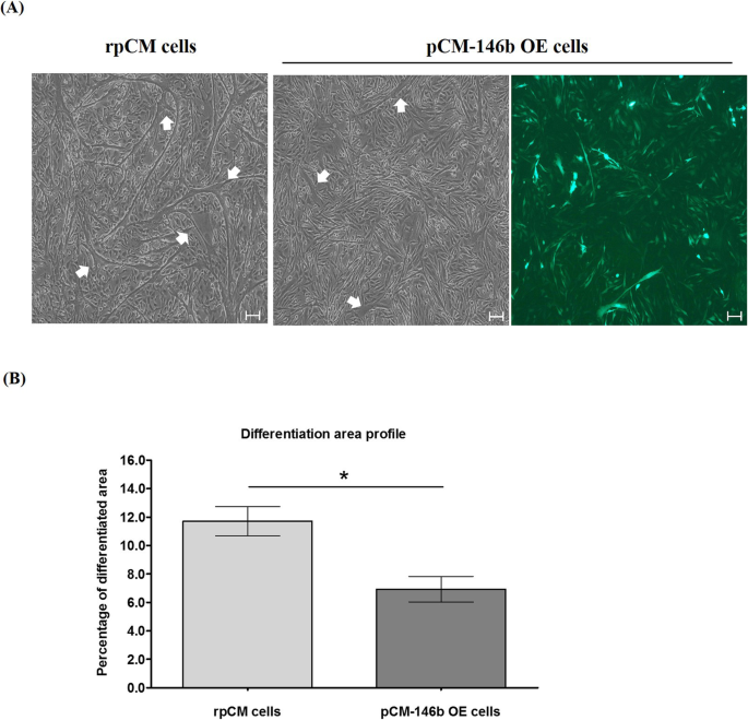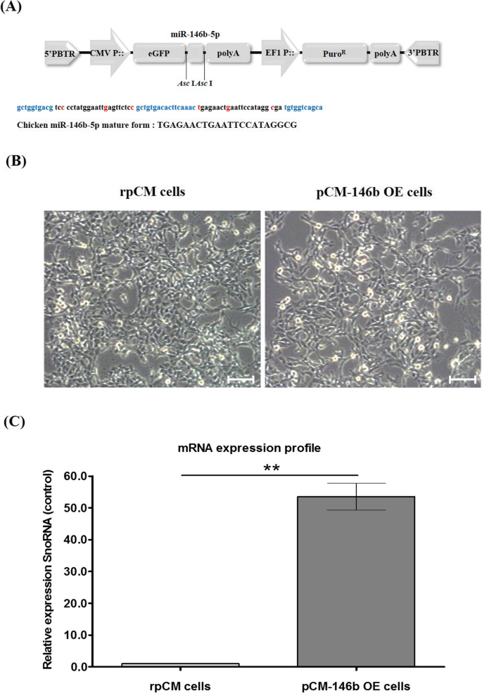 实验目的是获得稳定过表达miR-146b-5p的鸡原代肌细胞(pCM),为后续功能验证提供细胞模型。方法细节为:利用piggyBac转座子系统构建包含miR-146b-5p和绿色荧光蛋白(GFP)的表达载体,通过Lipofectamine 3000转染鸡原代肌细胞,经嘌呤霉素筛选获得稳定转染细胞;采用实时荧光定量PCR(qRT-PCR)检测miR-146b-5p的表达水平,同时观察细胞形态。结果解读:qRT-PCR结果显示,过表达细胞(pCM-146b OE)中miR-146b-5p的表达水平较常规pCM(rpCM)显著上调(p<0.01),细胞形态与rpCM无明显差异,表明成功构建稳定过表达细胞模型。