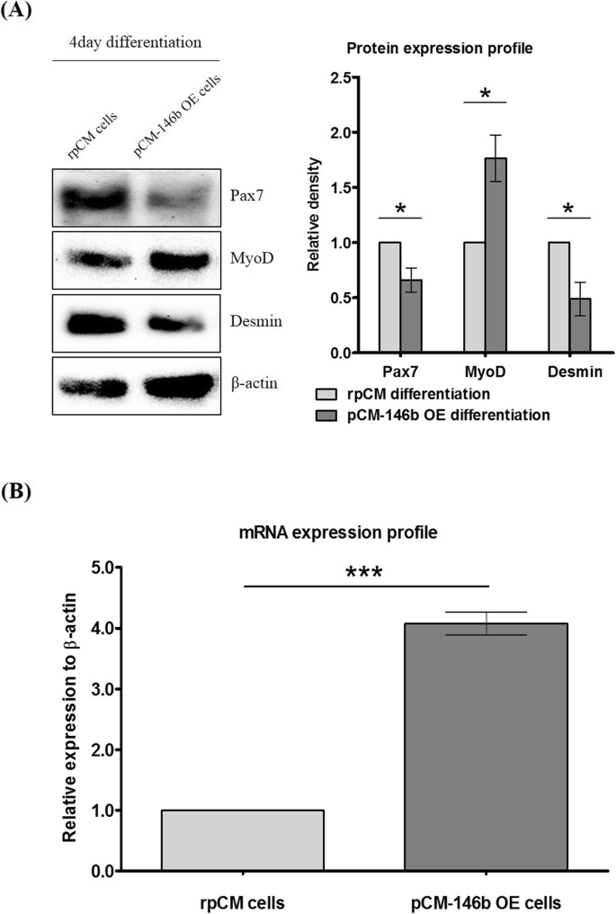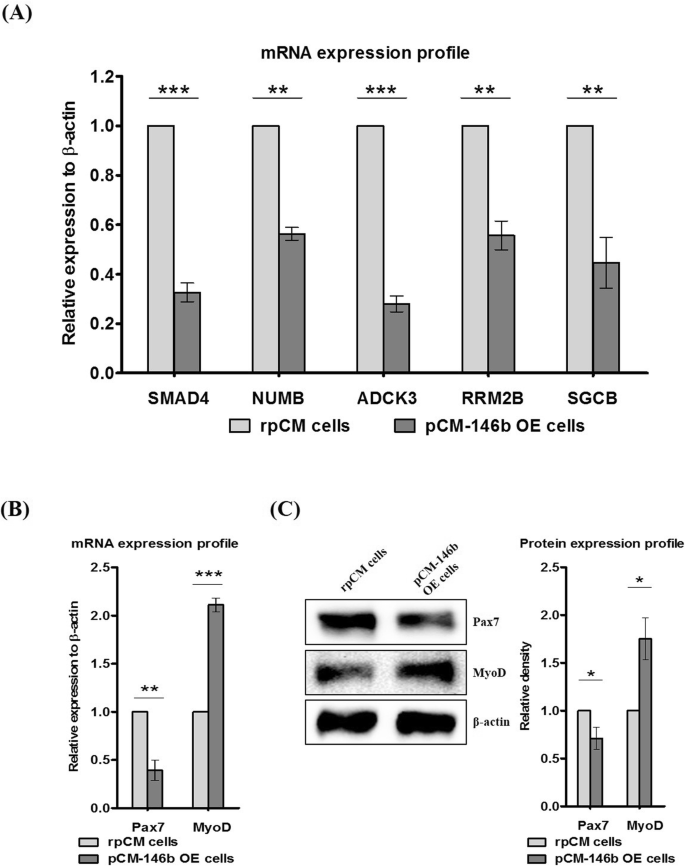实验目的是解析miR-146b-5p对肌源性标记物及预测靶基因的转录调控作用。方法细节为:采用实时荧光定量PCR检测miR-146b-5p预测靶基因(Smad4、Numb、Adck3、Rrm2b、Sgcb)及肌源性标记物(PAX7、MYOD)的mRNA表达水平,同时通过免疫印迹(Western blotting)检测PAX7、MYOD的蛋白表达水平。结果解读:实时荧光定量PCR结果显示,所有预测靶基因在pCM-146b OE细胞中均显著下调(n=3,p<0.01或p<0.001);肌源性标记物中,PAX7的mRNA与蛋白表达均下调,MYOD的mRNA与蛋白表达均上调(n=3,p<0.05),表明miR-146b-5p可通过调控靶基因及肌源性标记物的表达影响肌细胞状态。