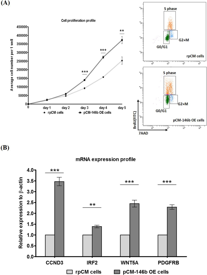 实验目的是明确miR-146b-5p对鸡原代肌细胞增殖的调控作用。方法细节为:通过细胞计数比较pCM-GFP细胞与pCM-146b OE细胞的增殖速率;采用BrdU流式细胞术检测细胞周期分布;利用实时荧光定量PCR检测增殖相关基因(Ccnd3、Irf2、Wnt5a、Pdgfrb)的表达水平。结果解读:细胞计数显示,培养3天后pCM-146b OE细胞的增殖速率显著高于pCM-GFP细胞(n=3,p<0.01);BrdU流式细胞术结果显示,pCM-146b OE细胞中S期细胞比例从rpCM的22.6±0.9%升至47.8±6.0%(n=3);增殖相关基因的mRNA表达水平均显著上调(n=3,p<0.01或p<0.001),表明miR-146b-5p可显著促进鸡原代肌细胞的增殖。