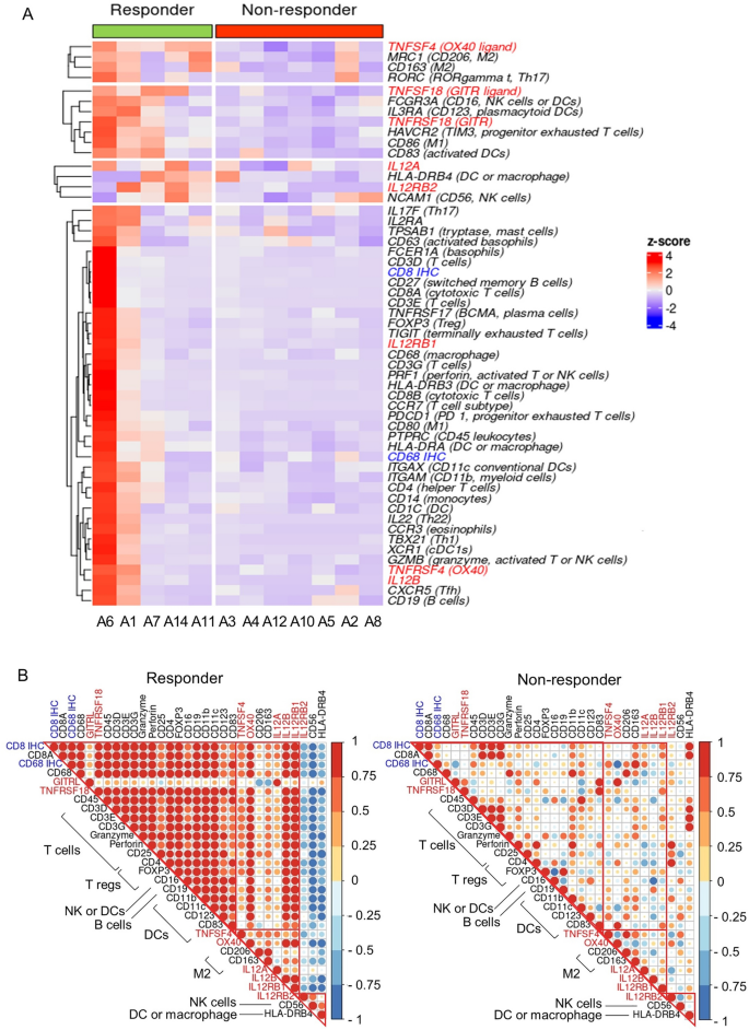 实验目的为明确候选基因在免疫细胞中的来源及功能关联,解析其调控免疫微环境的机制。方法细节上,分析三个候选基因与44个免疫细胞标志物基因的表达相关性,采用Pearson相关系数评估应答者与非应答者中的关联差异。结果解读显示,应答者中TNFRSF18(GITR)与T细胞、Treg细胞、NK细胞、树突状细胞的标志物高度相关,提示其广泛参与多种免疫细胞的功能调控;TNFSF4(OX40L)与M2巨噬细胞标志物(CD206、CD163)相关,提示其与巨噬细胞的极化与功能有关;IL12RB2与NK细胞标志物CD56相关,提示其参与NK细胞的功能调控;而在非应答者中,三个候选基因与免疫细胞标志物无明确相关性,进一步说明这些基因的功能仅在免疫激活的微环境中发挥作用。