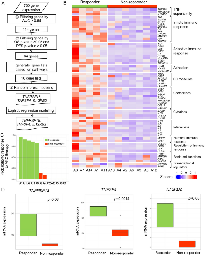 实验目的为对比应答者与非应答者的肿瘤免疫基因表达差异,筛选潜在的预测生物标志物。方法细节上,提取样本总RNA,采用NanoString nCounter PanCancer免疫分析面板检测730个免疫与肿瘤相关基因的表达水平;通过三步分析流程筛选候选基因:首先选取ROC曲线下面积(AUC)≥0.85的基因,其次选取与OS或PFS相关(P<0.05)的基因,最后利用随机森林模型构建预测模型并评估基因的预测重要性。结果解读显示,应答者的免疫相关基因整体表达水平显著高于非应答者,提示其肿瘤微环境呈免疫激活状态;共鉴定出35个差异表达基因(DEGs),其中33个在应答者中高表达,仅NOTCH1在非应答者中高表达;主成分分析(PCA)显示,除1例外,应答者与非应答者可通过35个DEGs明显区分。随机森林模型分析显示,TNF超家族中的TNFRSF18、TNFSF4、IL12RB2三个基因组成的模型预测性能最佳,袋外误差率为0%,敏感性与特异性均为1.0,预测准确率达100%(95% CI 73.5-100%);三个基因在应答者中的mRNA表达水平分别为非应答者的2.8倍(TNFRSF18,P=0.06)、1.7倍(TNFSF4,P=0.0014)、2.0倍(IL12RB2,P=0.06)。