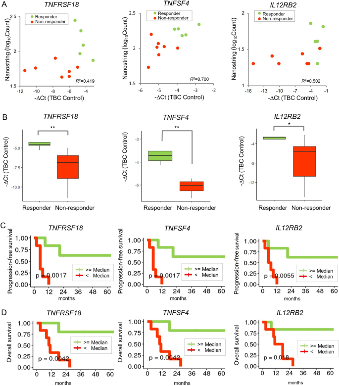 实验目的为验证候选基因的表达水平,并分析其与患者临床预后的关联。方法细节上,采用SuperScript™ IV VILO™ Master mix反转录RNA为cDNA,通过TaqMan™基因表达试剂盒进行qRT-PCR检测,以TBP为内参基因计算相对表达量;利用留一法交叉验证评估逻辑回归模型的预测性能;根据三个基因的中位表达水平将患者分为高表达组与低表达组,采用生存分析评估基因表达与PFS、OS的关联。结果解读显示,qRT-PCR检测结果与NanoString分析结果高度相关,Pearson相关系数分别为TNFRSF18(0.419)、TNFSF4(0.700)、IL12RB2(0.502);逻辑回归模型的预测准确率达100%(95% CI 73.54-100%),可有效区分应答者与非应答者;生存分析显示,高表达三个基因的患者PFS与OS均显著优于低表达组,其中TNFRSF18高表达组的PFS P=0.0017,OS P=0.0042;TNFSF4高表达组的PFS P=0.0017,OS P=0.0042;IL12RB2高表达组的PFS P=0.0055,OS P=0.018。