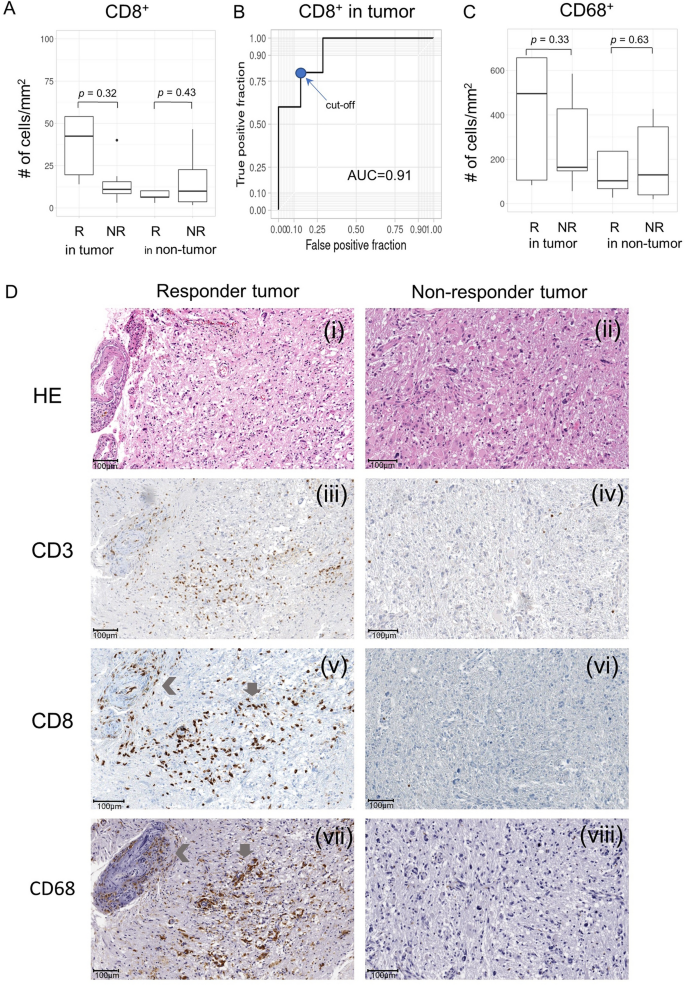 实验目的为分析应答者与非应答者肿瘤组织中免疫细胞的浸润差异,关联候选基因的表达与免疫微环境特征。方法细节上,对肿瘤组织样本进行免疫组化(IHC)染色,检测T细胞标志物CD3、细胞毒性T细胞标志物CD8、巨噬细胞/小胶质细胞标志物CD68的表达,采用QuPath软件分析阳性细胞的密度(个/mm²),对比应答者与非应答者的免疫细胞浸润差异。结果解读显示,应答者肿瘤组织中CD8⁺细胞毒性T细胞的平均密度为169.6±306.8个/mm²,是非应答者(14.62±12.2个/mm²)的11.5倍,尽管因样本量较小差异无统计学意义(P=0.32),但CD8⁺细胞密度的ROC曲线AUC为0.91,以19.225为截断值时,敏感性为0.8,特异性为0.86,可有效预测治疗反应;应答者肿瘤组织中CD68⁺巨噬细胞/小胶质细胞的平均密度为621.2±684.7个/mm²,是非应答者(279.5±198.1个/mm²)的2.2倍,差异同样无统计学意义(P=0.33);应答者中CD8⁺与CD68⁺细胞的密度高度相关(Pearson相关系数=0.95,P=0.013),提示这些免疫细胞在应答者的肿瘤微环境中存在密切相互作用,而在非应答者中无此相关性。