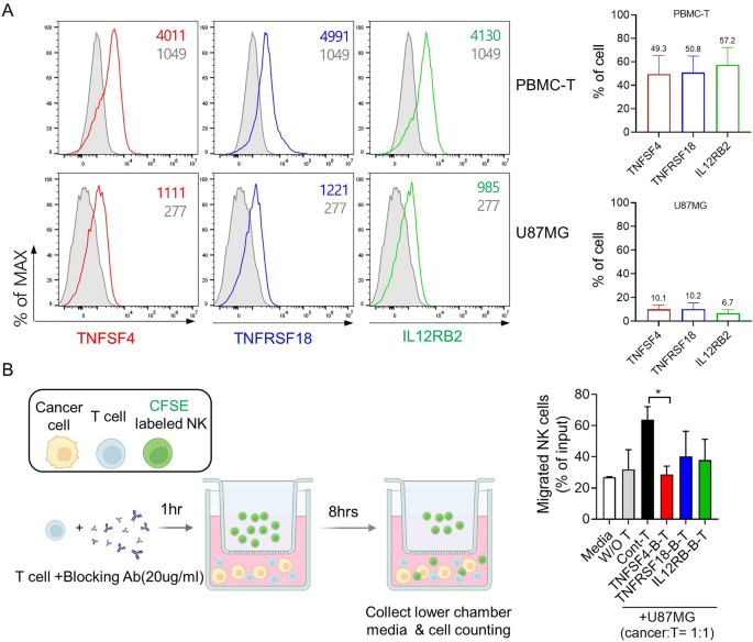 实验目的为验证候选基因表达对NK细胞向肿瘤细胞迁移的调控作用,解析其促进NK细胞治疗反应的功能机制。方法细节上,采用Transwell小室(8μm孔径)构建体外迁移模型,下室接种U87MG胶质母细胞瘤细胞或U87MG+T细胞,上室接种CFSE标记的NK细胞;使用特异性抗体阻断T细胞上的TNFSF4、TNFRSF18、IL12RB2表达,培养8h后通过细胞计数仪统计迁移至下室的NK细胞比例;同时通过流式细胞术检测T细胞与U87MG细胞上三个候选基因的表达水平。结果解读显示,活化T细胞高表达三个候选基因,其中TNFSF4的阳性率为62.29%,TNFRSF18为63.49%,IL12RB2为69.59%;阻断T细胞上的TNFSF4表达后,NK细胞向肿瘤细胞的迁移比例显著降低至26.9%±2.0%(P=0.027),阻断TNFRSF18与IL12RB2后迁移比例分别为42.1%±9.6%(P=0.195)和37.8%±9.6%(P=0.146),提示三个基因尤其是TNFSF4可促进NK细胞向肿瘤微环境迁移,增强NK细胞的抗肿瘤作用。