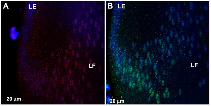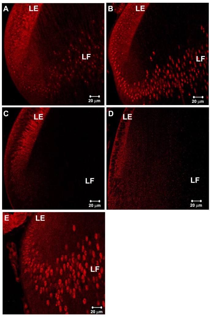 实验目的是比较晶状体上皮细胞与纤维细胞中信号分子的亚细胞分布差异,揭示细胞类型特异性的信号调控机制。方法细节为对晶状体上皮细胞和纤维细胞分别进行免疫荧光染色,观察信号分子在细胞质内体及细胞核的定位模式。结果解读显示,pSmad1、pSmad2、Smad4、Smad7、c-Ski和TGIF在晶状体纤维细胞中同时定位于内体和细胞核,而在晶状体上皮细胞中主要富集于内体,细胞核中几乎无积累;衔接蛋白SARA和C184M在两种细胞类型中均仅定位于内体,未进入细胞核。这一结果提示,晶状体上皮细胞中存在特异性机制,抑制激活的Smad复合物向细胞核转运,与体外细胞系中激活Smad直接入核的模式存在显著差异。