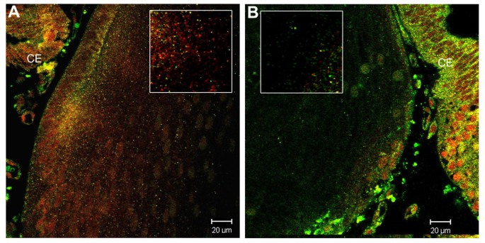 实验目的是获取保留亚细胞结构的体内晶状体组织样本,建立BMP信号缺失的功能验证模型,为后续定位分析提供基础。方法细节为选用发育至E7的鸡胚晶状体和出生后3天(P3)的小鼠晶状体作为研究对象,通过将Bmpr1a floxed小鼠与LeCre小鼠交配,构建晶状体特异性Bmpr1a条件敲除(CKO)小鼠模型;将晶状体组织用10%福尔马林固定1-2小时后,包埋于4%琼脂中,使用振动切片机制备100μm厚的组织切片。结果解读显示,成功制备的厚切片可清晰保留细胞的亚细胞结构,Bmpr1a CKO小鼠晶状体呈现明显的发育异常,表现为晶状体体积减小、上皮层变薄,与之前报道的Bmpr1a调控晶状体发育的表型一致。实验所用关键产品:Upstate Biotechnology的磷酸化Smad1抗体、Cell Signaling Technology的磷酸化Smad2/β-微管蛋白抗体、Santa Cruz Biotechnology的Smad4/Smad6/Smad7/SARA/c-Ski/Rab5B/Rab7抗体、Calbiochem的EEA1抗体、BD Transduction Laboratories的EEA1/小窝蛋白1抗体、Molecular Probes的Alexa-Fluor标记二抗/鬼笔环肽/TOTO-1/TOPRO、Vector labs的VectaShield封片剂。