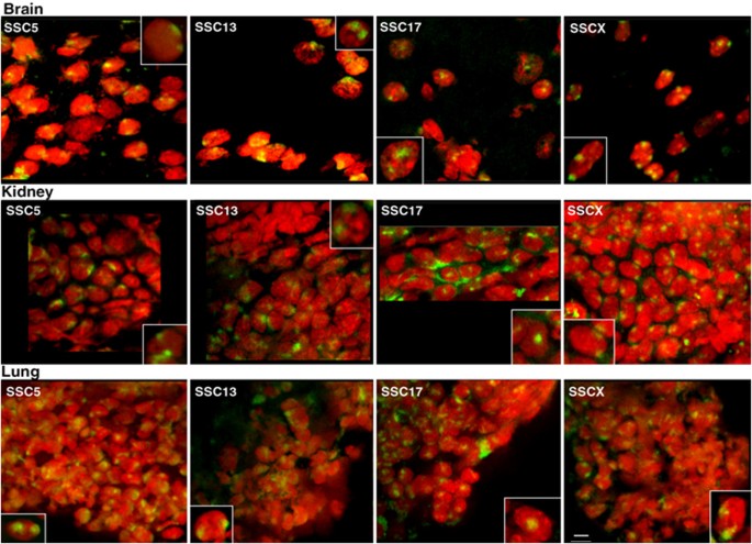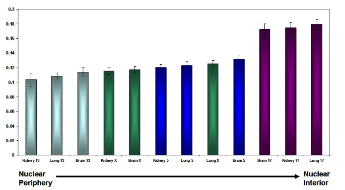 该生物标志物的定位逻辑为,首先通过多细胞/组织类型的定位分析确认猪染色体定位的保守性,随后对比基因密度与染色体大小两种因素的预测结果,验证其与实际定位的相关性。研究过程中,该标志物的来源为猪各染色体的DNA含量数据,验证方法为侵蚀分析的归一化信号分布、3D距离测量的统计分析,特异性表现为大染色体(如SSC13,约190 Mbp)在核外周壳层的归一化信号占比显著高于小染色体(如SSC17,约60 Mbp)(n=50,P<0.05,文献未明确具体数值),敏感性表现为90%以上的染色体定位符合大小相关的分布规律;不同细胞/组织类型中该相关性均保持稳定,无显著差异。
