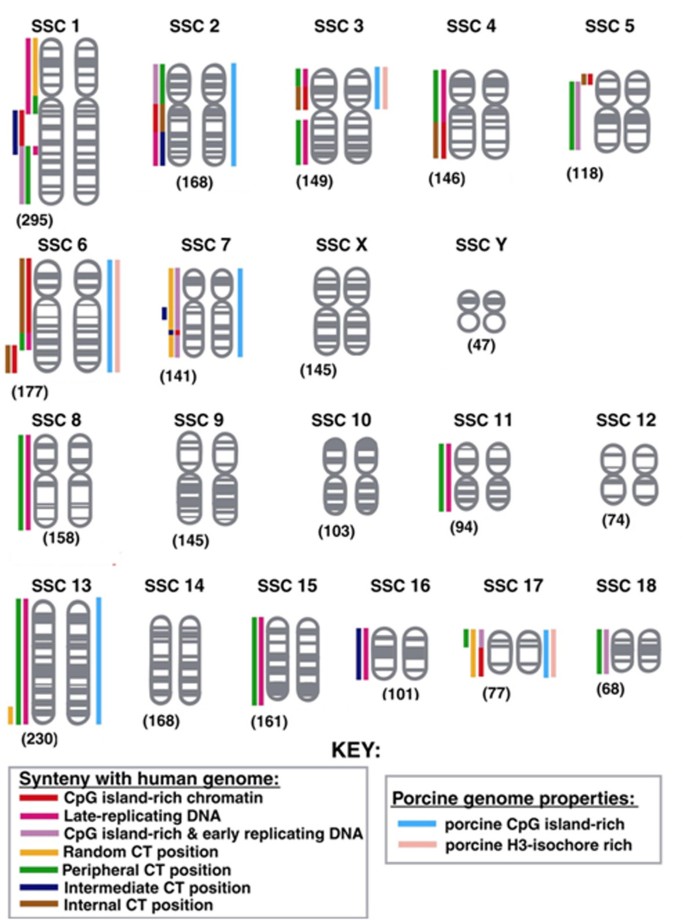 现有研究的关键结论显示,人类、小鼠、鸟类等多个物种的间期染色体均呈非随机定位,人类增殖细胞中高基因密度的染色体偏向细胞核内部,低基因密度的偏向核外周,而静息细胞中染色体定位则与大小相关,大染色体偏向核外周;部分研究显示染色体定位具有组织特异性,细胞分化过程中会发生染色体疆域的重定位,且与基因表达调控直接相关。技术方法方面,现有研究多采用荧光原位杂交结合图像分析技术,能精准标记并量化染色体在细胞核中的位置,其中侵蚀分析方法可将细胞核分为同心壳层,实现染色体定位的半定量分析;但现有研究存在明显局限性,多数研究集中于人类和小鼠,猪等重要模型动物的研究极少,且缺乏体外培养细胞与体内组织细胞的定位对比,同时猪基因组注释的不完全性限制了对定位调控机制的深入解析。
