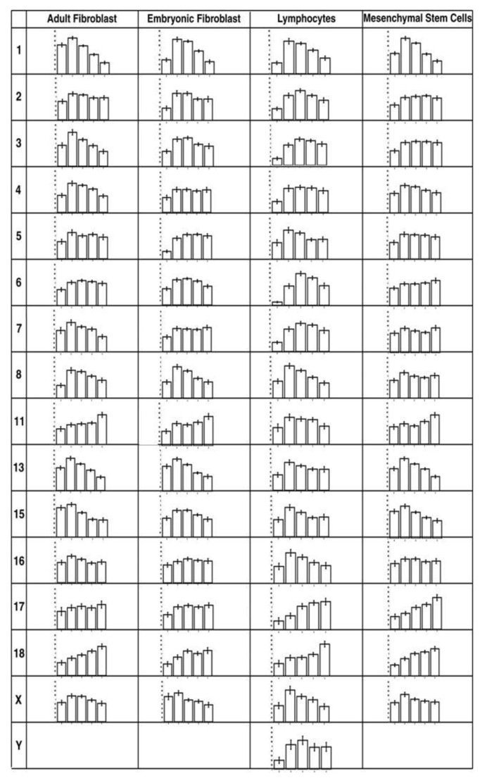 实验目的是量化染色体在细胞核中的径向位置,分析不同细胞/组织类型间的定位差异,并探讨定位的调控因素。方法细节包括:2D图像采用侵蚀分析脚本,将细胞核分为5个面积相等的同心壳层(壳1为核外周,壳5为核内部),计算每个壳层中染色体信号与DNA信号的归一化比值,确定染色体的平均位置;3D图像通过共聚焦显微镜采集光学切片,用Imaris软件重构细胞核三维结构,测量染色体疆域中心到最近核边缘的距离,并归一化处理;采用单因素ANOVA分析不同体外细胞类型的定位差异,非配对t检验分析体内组织间的差异。结果解读显示,2D侵蚀分析显示,多数猪染色体在四种体外细胞类型中的定位高度保守,仅淋巴细胞中核外周壳层的染色体信号略少(n=50,P>0.05,无统计学显著差异);3D分析显示,大染色体(如SSC13、X)在三种体内组织中均偏向核外周,小染色体SSC17偏向核内部,且不同组织间定位无显著差异(n=60,P>0.05);对比基因密度与染色体大小的预测,发现猪染色体定位与DNA含量(大小)的相关性更强,仅少数染色体符合基因密度预测。
