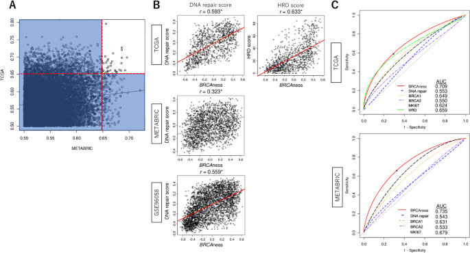 本环节旨在筛选与BRCA1突变高度相关的基因,构建可靠的BRCAness评分体系并验证其性能。研究人员通过受试者工作特征曲线下面积(ROC-AUC)分析,在TCGA和METABRIC队列中筛选出34个与BRCA1突变显著关联的基因(AUC>0.65),采用基因集变异分析(GSVA)算法基于这些基因的表达水平构建BRCAness评分。随后通过Spearman秩相关分析验证评分与DNA修复评分、同源重组缺陷(HRD)评分的相关性,结果显示BRCAness评分与DNA修复评分在TCGA队列的相关系数为0.593(n=1069,P<0.001),在GSE96058队列为0.559(n=3273,P<0.001),与HRD评分在TCGA队列的相关系数为0.633(n=1069,P<0.001);ROC-AUC分析显示,该评分对BRCA1突变的区分能力在TCGA队列AUC为0.709,在METABRIC队列为0.735,显著优于DNA修复评分、BRCA1/2基因表达等其他BRCAness相关因子。