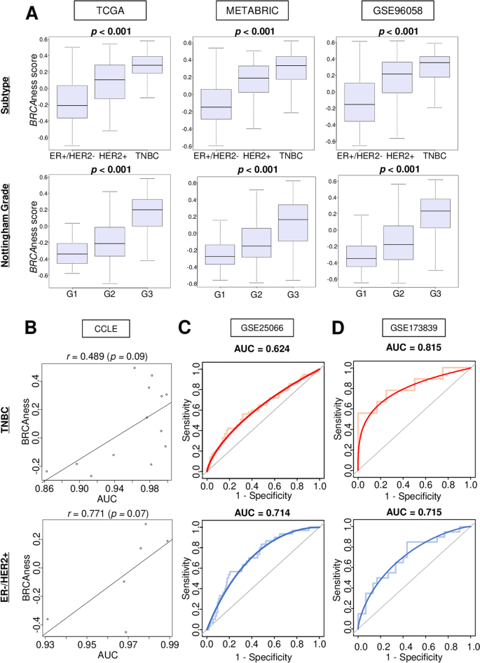 本环节的核心目标是验证BRCAness评分对化疗及PARP抑制剂响应的预测价值,明确其临床转化潜力。研究人员在接受蒽环类联合紫杉类新辅助化疗的GSE25066队列中分析发现,BRCAness评分对TNBC和雌激素受体阳性/人表皮生长因子受体2阴性(ER+/HER2-)乳腺癌的病理完全缓解(pCR)预测AUC分别为0.624(n=508,P<0.05)和0.714(n=508,P<0.05);在接受度伐利尤单抗联合奥拉帕利治疗的GSE173839队列中,评分对pCR的预测AUC分别提升至0.815(P<0.001)和0.715(P<0.001)。此外,CCLE细胞系数据显示,BRCAness评分与奥拉帕利的敏感性呈正相关,TNBC细胞系的相关系数为0.489,ER+/HER2-细胞系为0.771,提示该评分可有效预测不同亚型乳腺癌对PARP抑制剂的响应。