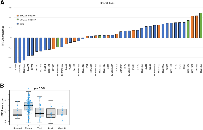 现有研究支持BRCAness由HRR基因功能缺失、表观调控异常等多因素共同驱动,可有效预测乳腺癌患者对化疗及PARP抑制剂的响应;现有技术方法中,基因组HRD评分可通过检测染色体不稳定性反映同源重组缺陷,但其优势仅局限于BRCA突变或特定HRR基因变异的患者,局限性在于未考虑肿瘤微环境中非肿瘤细胞对BRCAness的贡献,且临床应用严格依赖BRCA胚系突变检测,无法覆盖BRCA野生型的高BRCAness患者。通过对比现有研究的不足,本文的创新价值在于首次基于BRCA1突变相关的34个基因表达谱,采用基因集变异分析(GSVA)算法构建跨大样本队列验证的BRCAness评分体系,纳入肿瘤微环境细胞的贡献,可独立于BRCA突变状态预测PARP抑制剂的响应,为BRCA野生型高BRCAness患者的精准治疗提供依据。