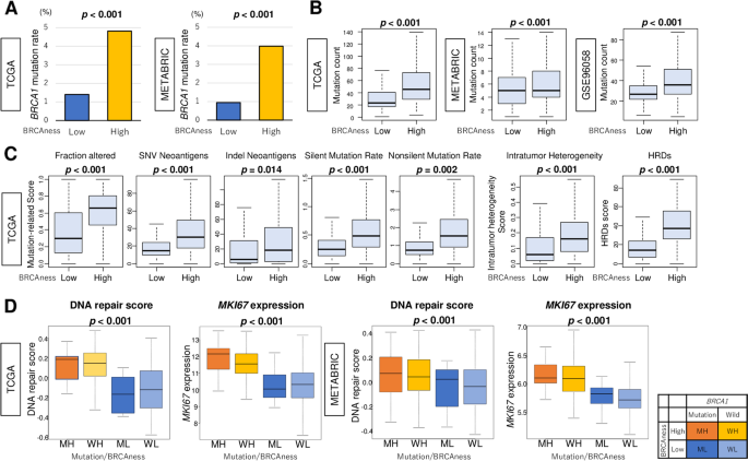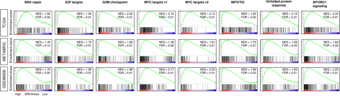 本环节旨在明确BRCAness评分与乳腺癌核心生物学特征的关联,验证其对BRCAness表型的反映能力。研究人员对比高低BRCAness组(以三分位数为cutoff)的突变负荷、DNA修复活性及细胞增殖相关指标,结果显示高BRCAness组的突变计数在三个队列均显著更高(n=6245,P<0.001),同时与高HRD评分、肿瘤内异质性显著相关;DNA修复评分和MKi67基因表达在高BRCAness组显著升高,且该关联独立于BRCA1突变状态。基因集富集分析(GSEA)结果显示,高BRCAness组不仅显著富集DNA修复相关基因集,还一致富集所有5个细胞增殖相关的Hallmark基因集(包括有丝分裂纺锤体、MYC靶点等),提示高BRCAness与乳腺癌的侵袭性表型密切相关。此外,三阴性乳腺癌(TNBC)的BRCAness评分在三个队列中均为最高,且与高Nottingham病理分级显著相关(n=6245,P<0.001)。