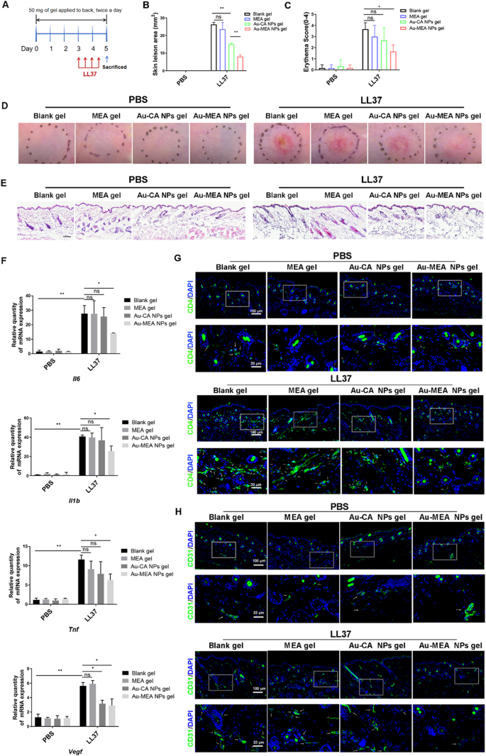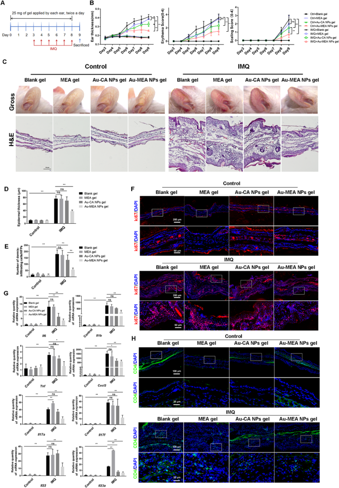 方法细节:构建IMQ诱导的小鼠银屑病模型,每日耳部涂抹5% IMQ乳膏,同时局部涂抹空白凝胶、MEA凝胶、Au-CA NPs凝胶或Au-MEA NPs凝胶,连续给药9天;构建LL37诱导的小鼠玫瑰痤疮模型,背部皮肤连续5天涂抹凝胶,最后2天皮内注射LL37诱导皮损;通过临床评分(耳厚、红斑、鳞屑)、苏木精-伊红(H&E)染色、免疫荧光、实时定量聚合酶链反应(qRT-PCR)评估治疗效果。