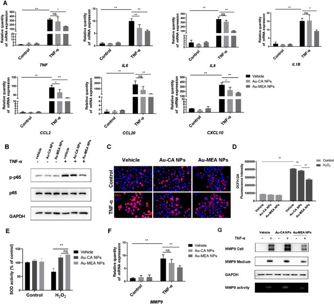 结果解读:Au-MEA NPs显著抑制TNF-α诱导的IL-6、TNF-α等炎症因子mRNA表达(n=3,P<0.05),减少p65磷酸化及核移位(n=3,P<0.01);H₂O₂处理后,Au-MEA NPs显著降低细胞ROS水平(n=3,P<0.01),提升SOD活性(n=3,P<0.05);同时,Au-MEA NPs抑制MMP9的mRNA表达、蛋白水平及活性(n=3,P<0.01),而Au-CA NPs对MMP9活性无显著抑制作用。结果表明Au-MEA NPs通过提升SOD活性清除ROS,抑制MMP9活性,进而阻断NF-κB通路,减少炎症因子分泌。