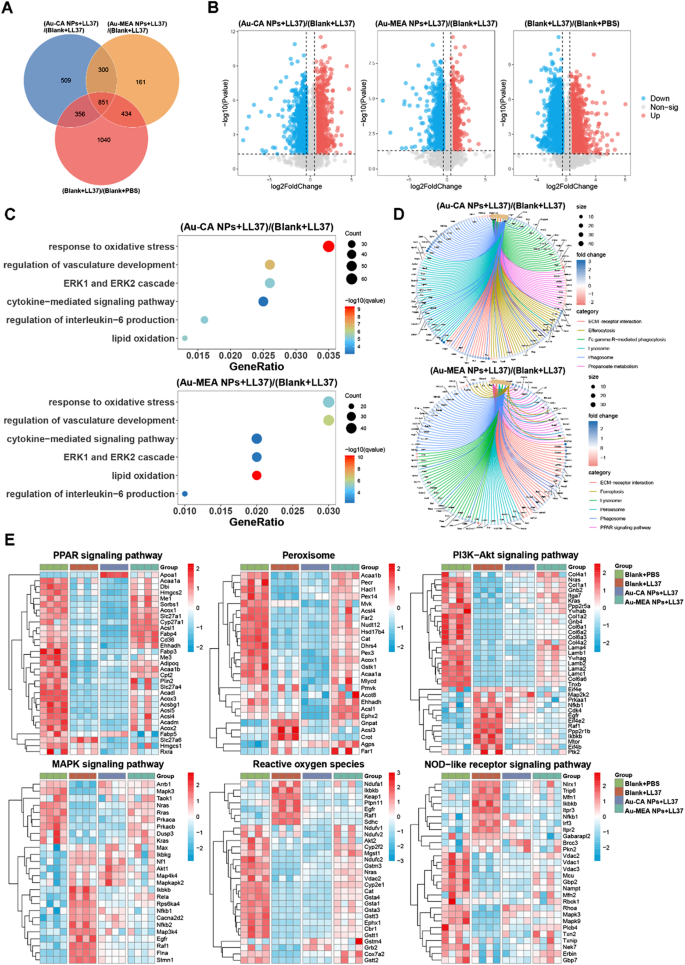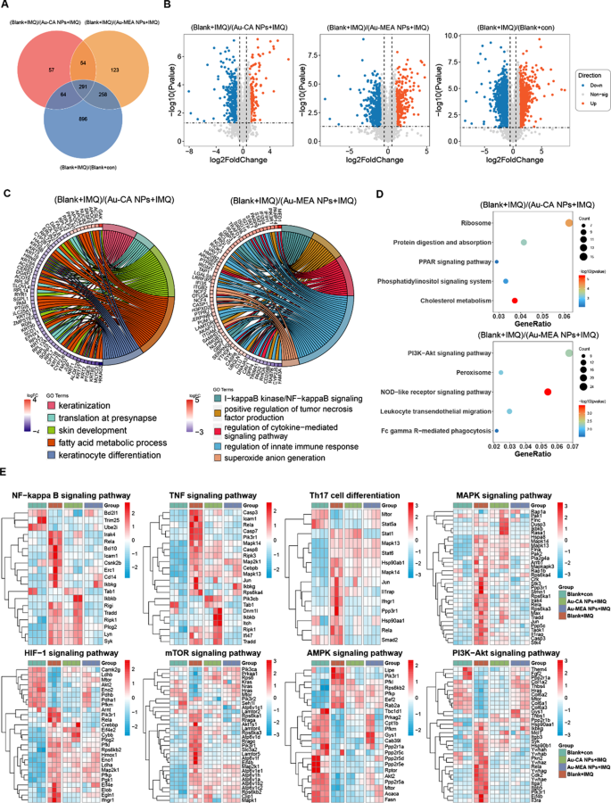 结果解读:在银屑病模型中,与空白凝胶组相比,Au-MEA NPs组有726个DEPs,富集于NF-κB信号通路、TNF信号通路等炎症相关通路;在玫瑰痤疮模型中,Au-MEA NPs组有1746个DEPs,富集于PI3K-Akt信号通路、MAPK信号通路、氧化应激相关通路。聚类分析显示,Au-MEA NPs可逆转炎症和氧化应激相关通路的异常激活,使其接近正常水平,提示其通过调控炎症与氧化应激通路发挥治疗作用。