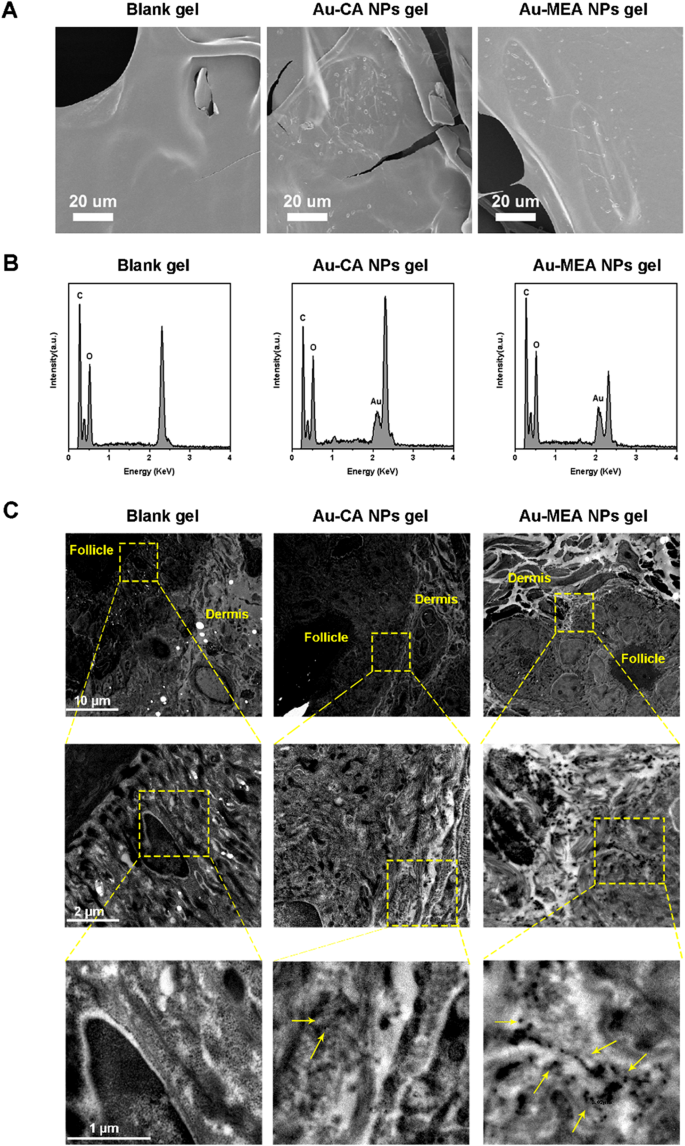 方法细节:将Au-CA NPs、Au-MEA NPs分别与SEPIMAX ZEN凝胶混合制备纳米颗粒凝胶,通过扫描电子显微镜(SEM)和能量色散X射线光谱(EDS)表征凝胶的形貌与元素组成;将凝胶局部涂抹于小鼠背部皮肤5天后,通过TEM观察皮肤组织中纳米颗粒的分布,ICP-MS检测皮肤组织中的金含量。