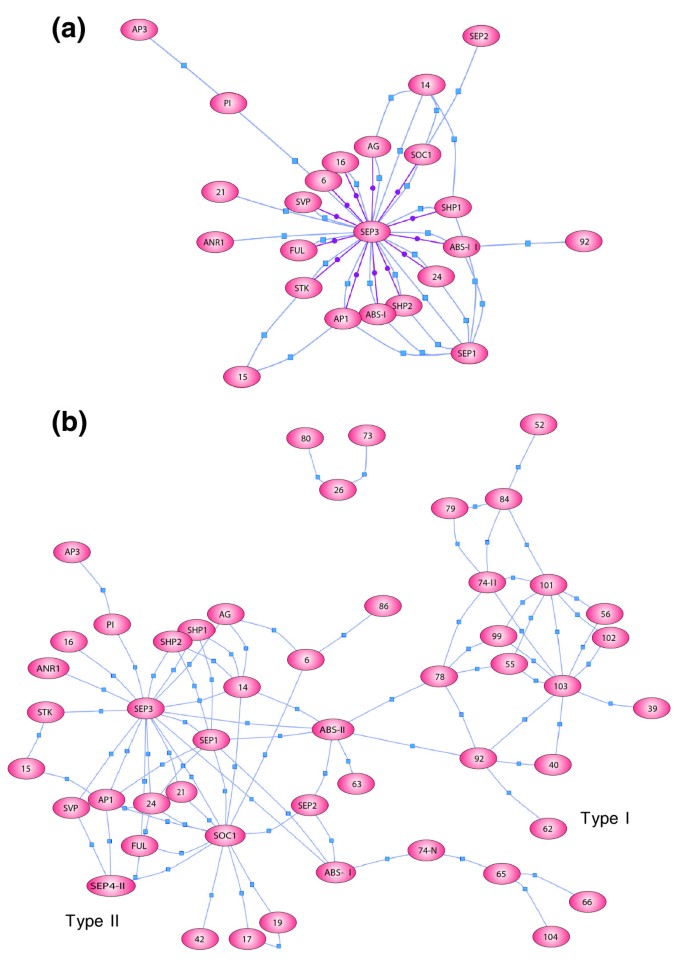 实验目的是系统鉴定SEP3参与的所有潜在三元复合物。方法细节:用SEP3ΔC2重构所有已知SEP3二聚体,将该二聚体文库与单个MADS盒蛋白文库进行双向酵母三杂交筛选,重复验证阳性克隆并排除假阳性。结果解读:新增59个三元复合物,使研究累计鉴定到106个三元复合物,其中78个复合物包含至少一个SEP家族蛋白;构建的MADS盒蛋白互作网络显示,SEP3是网络中的核心枢纽节点,连接了花器官发育、开花时间调控等多个功能亚家族的蛋白。