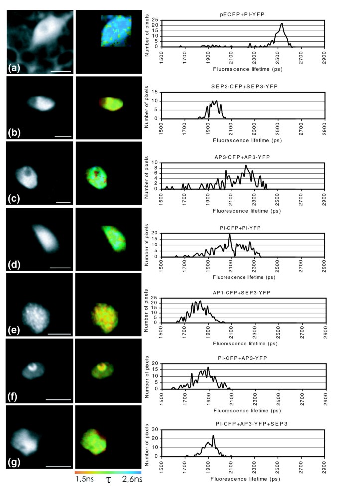 实验目的是在植物活细胞中验证AP3-PI-SEP3三元复合物的形成及SEP3的调控作用。方法细节:将AP3、PI、SEP3分别与增强型青色荧光蛋白(CFP)或黄色荧光蛋白(YFP)进行C端融合,瞬时转化拟南芥叶肉原生质体,用共聚焦激光扫描显微镜观察亚细胞定位;通过FRET-FLIM检测蛋白间的直接物理相互作用,每个组合至少分析10个细胞,重复3次实验。结果解读:PI与SEP3单独表达时定位于细胞核,AP3单独表达时同时存在于细胞核与细胞质,与PI共表达时则完全定位于细胞核;FRET-FLIM结果显示,SEP3可高效形成同源二聚体,AP3与PI可形成异源二聚体,且SEP3能介导AP3-PI复合物的形成,并将其核内定位从核仁周围的环状分布转变为全核分布,说明SEP3不仅稳定复合物,还调控复合物的亚核定位以发挥功能。