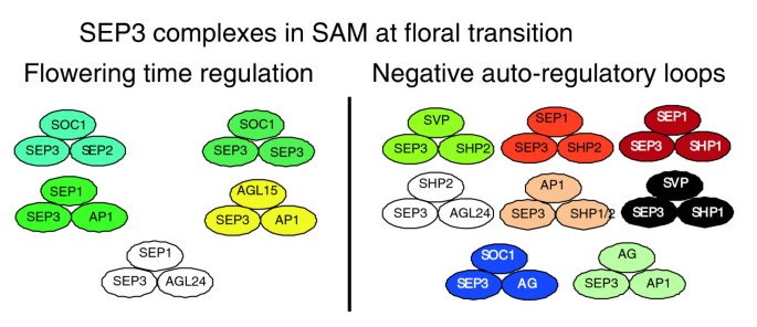 SEP3的功能关联包括:作为核心“黏合剂”参与花器官发育、开花时间调控、种子发育等多个发育过程的复合物形成,在花器官发育中介导ABCDE功能因子的多聚化,在开花时间调控中连接花器官身份因子与开花时间调控因子形成负反馈复合物;创新性在于首次明确MADS盒蛋白多聚化是全家族普遍机制,Type I与Type II亚家族均具备多聚化能力,首次揭示SEP3通过调控复合物亚核定位影响功能的新机制;研究还推论,SEP3的同源蛋白SEP1/2/4可能存在部分功能冗余,但也具备特异性的复合物结合能力,需进一步研究其各自的调控网络。