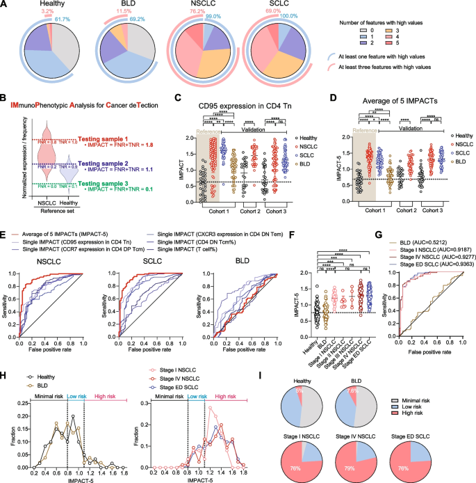IMPACT-5评分在肺癌患者中显著高于健康对照和BLD患者,I期NSCLC、IV期NSCLC、SCLC患者的ROC曲线AUC分别为0.9187、0.9277、0.9363,而BLD患者的AUC仅为0.5212;风险分层显示76%的I期NSCLC患者被归为高风险组,仅5%的健康对照为高风险组(验证队列健康对照n=60、I期NSCLC n=25,P<0.0001),表明模型具有优异的早期诊断特异性和效能。实验所用关键产品:文献未提及具体实验产品,领域常规使用流式细胞数据分析软件、ROC曲线分析工具等。