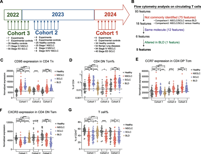 实验目的是建立包含不同疾病状态的大样本队列,同时构建标准化的流式细胞术分析体系以降低实验变异。方法细节:回顾性收集452例外周血单个核细胞(PBMC)样本,分为206例NSCLC患者、100例SCLC患者、94例健康对照、52例良性肺部疾病(BLD)患者,设置3个独立队列用于特征发现和验证;采用10种表型标志物鉴定18种T细胞亚群,通过同一供体的PBMC分装样本作为实验内对照,确保T细胞亚群门控和分子表达分析的一致性。结果解读:通过标准化实验流程,消除了不同批次实验的变异,为后续特征筛选提供了可靠的基础数据。实验所用关键产品:文献未提及具体实验产品,领域常规使用流式细胞术抗体试剂盒、PBMC分离液、流式细胞分析仪等试剂/仪器。
