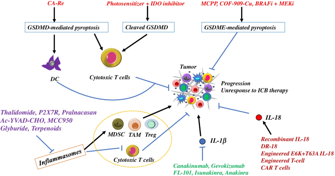 实验目的:总结靶向焦亡的肿瘤治疗进展及临床转化潜力。方法细节:整合临床前研究及临床试验数据,梳理不同治疗策略的作用机制及效果。结果解读:激活GSDMD/GSDME介导的焦亡可增强肿瘤免疫原性,与免疫检查点抑制剂联用可显著提升治疗效果;抑制NLRP3炎症小体可改善TIME,但部分研究显示其与PD-L1抑制剂联用存在拮抗效应;靶向IL-1β的单抗(如canakinumab)已进入临床试验,靶向IL-18的工程化改造策略(如DR-18、IL-18分泌型CAR-T)展现出良好的临床前效果。