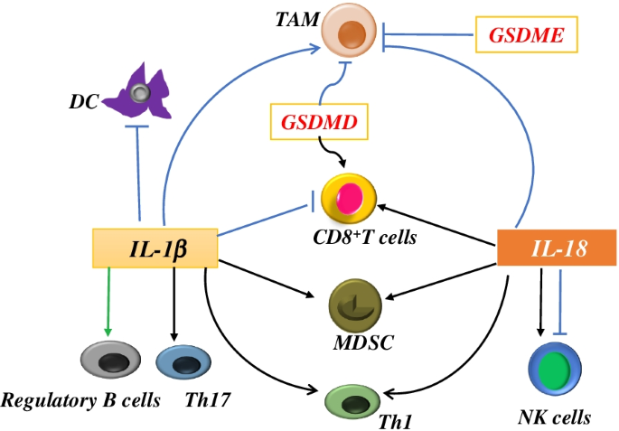 实验目的:明确焦亡核心组分(GSDM家族、炎症小体、IL-1β/IL-18)对TIME的双向调控作用。方法细节:整合生信分析、细胞实验及动物实验研究结果,分模块解析各组分的调控网络。结果解读:GSDMC可通过诱导肿瘤细胞焦亡促进树突状细胞(DC)成熟及CD8+T细胞浸润,GSDMD的亚细胞定位与结直肠癌中免疫细胞浸润相关,GSDME的作用呈现组织特异性;NLRP3炎症小体可通过招募MDSC、TAM抑制免疫,而NLRC4可促进效应T细胞活化;IL-1β和IL-18既可以激活Th1细胞及NK细胞的抗肿瘤功能,也可以诱导MDSC、TAM富集形成免疫抑制微环境。