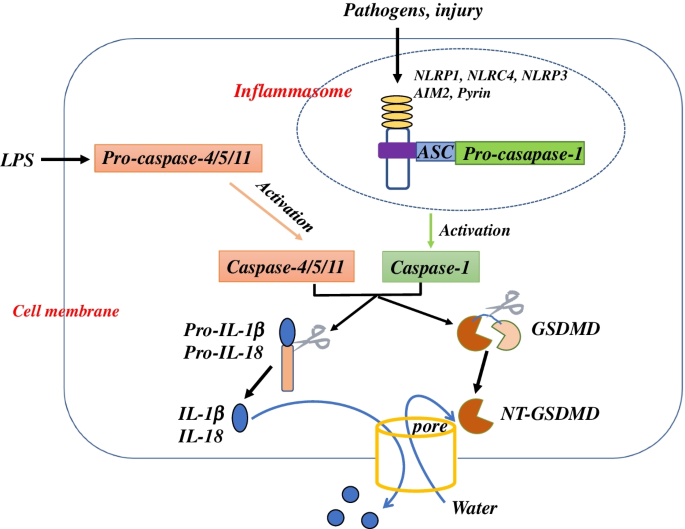 实验目的:系统总结细胞焦亡的三类核心调控通路。方法细节:整合已发表的分子机制研究,梳理不同通路的激活信号、关键蛋白酶及效应分子。结果解读:经典焦亡通路由NLRP3、AIM2等炎症小体识别病原体或损伤信号,激活caspase-1切割GSDMD,其N端结构域在细胞膜形成孔道引发细胞坏死并释放IL-1β、IL-18;非经典通路由胞内脂多糖(LPS)直接激活caspase-4/5(人)或caspase-11(小鼠)切割GSDMD;药物诱导通路由阿霉素、顺铂等化疗药物激活caspase-3切割GSDME,引发细胞焦亡。