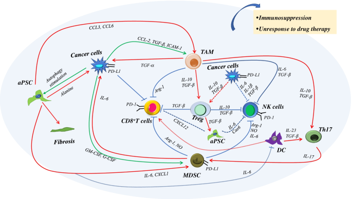 实验目的:以胰腺癌为典型“冷肿瘤”模型,明确TIME的组成及核心免疫抑制机制。方法细节:通过整合已发表的临床样本分析、细胞共培养及动物实验研究,系统梳理TIME中各类细胞及细胞因子的相互作用网络。结果解读:胰腺癌TIME中肿瘤细胞占比仅10%,TAM、MDSC、PSC等免疫抑制细胞富集,TAM可通过分泌Arg-1、TGF-β抑制CD8+T细胞功能,MDSC可通过活性氧(ROS)、一氧化氮(NO)通路抑制T细胞增殖,PSC可通过分泌细胞外基质形成物理屏障并招募免疫抑制细胞,共同构成免疫抑制的“冷肿瘤”微环境。