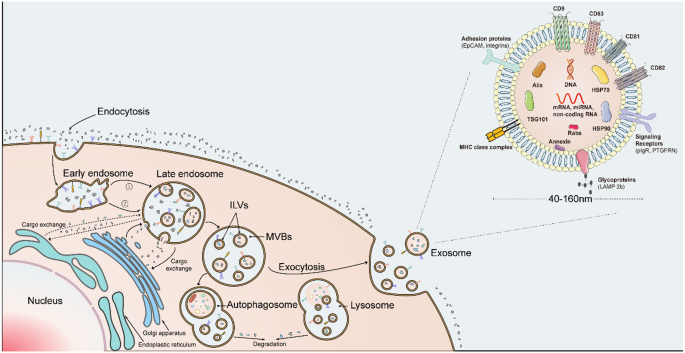 方法细节:综述了EV的分类(小EVs、大EVs、外泌体等),重点阐述了外泌体的生物发生过程,包括内体形成、多泡体(MVB)生成及分泌的ESCRT依赖和非依赖途径;鉴定方法包括透射电子显微镜(TEM)观察形态、纳米颗粒跟踪分析(NTA)检测粒径和浓度,以及CD9、CD63、CD81等四跨膜蛋白的免疫标记。