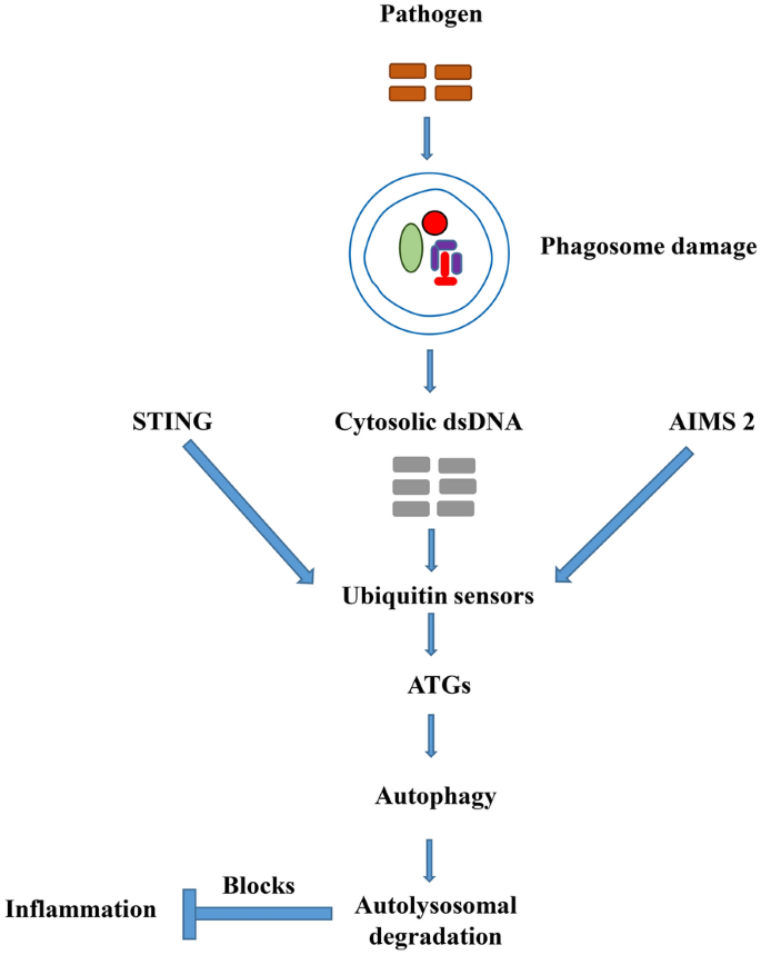 该环节的目标是解析自噬与宿主免疫通路的互作机制。作者梳理了模式识别受体(PRRs)尤其是 Toll样受体(TLRs)对自噬的调控作用:TLRs可通过识别寄生虫的PAMPs,激活TRIF-p38通路诱导自噬,进而清除寄生虫;同时,干扰素-γ(IFN-γ)可通过调控ATG蛋白的表达,增强自噬对寄生虫的清除能力。此外,作者还总结了自噬在抗原提呈中的作用:自噬可将寄生虫抗原递呈至MHC II类分子,激活CD4+T细胞介导的适应性免疫。文中还展示了胞质dsDNA诱导的STING依赖型免疫应答与自噬的互作机制,STING可调控I型干扰素的表达,同时自噬参与STING依赖的抗微生物应答,而Atg9a可负调控STING依赖的IFN应答。