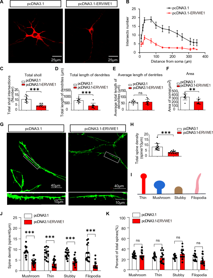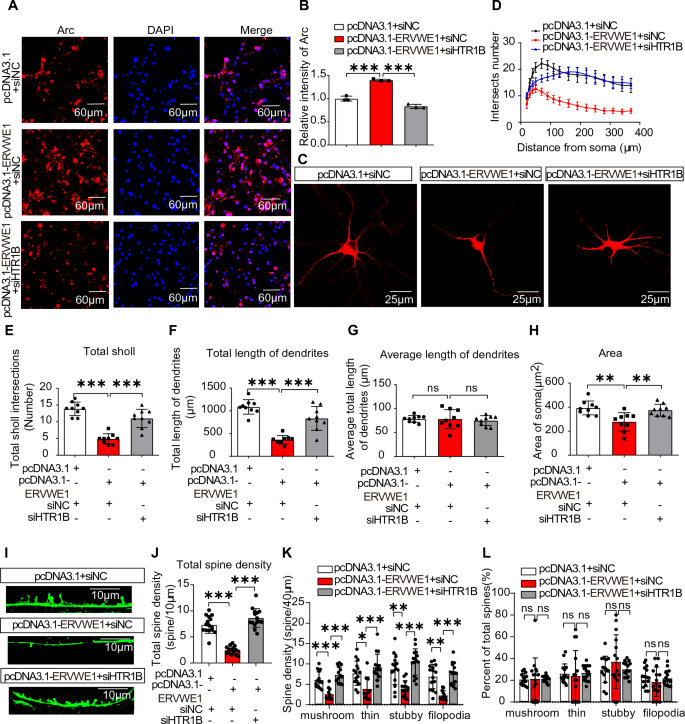 本环节实验目的为探究ERVWE1对5-HT神经元形态与突触可塑性的损伤作用,以及HTR1B在其中的介导功能。研究在DRN神经元中转染ERVWE1过表达质粒或联合转染HTR1B siRNA,采用免疫荧光染色标记微管相关蛋白2(MAP2)以观察神经元形态,标记树突棘以评估突触可塑性,通过Sholl分析、树突棘计数进行量化。结果显示,ERVWE1过表达显著降低5-HT神经元的树突分支数、总树突长度、胞体面积(n=9,p<0.01),以及总树突棘密度(n=15,p<0.001),且四种树突棘亚型(蘑菇型、短粗型、细长型、丝状伪足型)的密度均显著降低;敲低HTR1B可逆转ERVWE1诱导的神经元复杂性降低与树突棘密度减少。