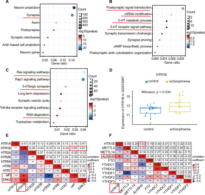本环节实验目的为通过公共数据库挖掘精神分裂症患者脑内基因表达与通路异常,筛选关键调控靶点。研究采用GSE53987数据集(含15例精神分裂症患者与19例健康对照的前额叶皮层尸检样本),进行差异表达基因(DEGs)分析、基因本体(GO)与京都基因与基因组百科全书(KEGG)富集分析、相关性分析。结果显示,GO细胞组分分析发现DEGs主要富集于突触结构,GO生物过程分析涉及突触后信号转导、mRNA修饰、5-HT受体信号通路;KEGG分析显示DEGs富集于Ras信号通路、5-HT能突触通路;HTR1B在患者脑内的mRNA表达水平显著高于健康对照(p=0.034,n=15/19);相关性分析显示HTR1B与ERK2、m6A去甲基化酶ALKBH5呈显著正相关(相关系数分别为0.61、0.52,p<0.05),提示HTR1B可能通过m6A修饰与ERK通路参与精神分裂症发病。