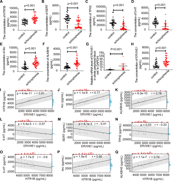 本环节实验目的为验证临床样本中ERVWE1与HTR1B、Arc、ALKBH5的表达关联,明确潜在风险因素。研究收集44例首发精神分裂症患者与37例健康对照的外周血样本,采用酶联免疫吸附实验(ELISA)检测血浆蛋白水平,实时荧光定量PCR(RT-qPCR)检测全血mRNA水平,进行相关性分析与多因素回归分析。结果显示,患者血浆中HTR1B、Arc、ALKBH5、ERVWE1的蛋白水平均显著高于健康对照(p<0.001),而5-羟色胺、5-羟色胺转运体(SERT)、色氨酸羟化酶-2(TPH2)的蛋白水平显著降低(p<0.001);ERVWE1与HTR1B、Arc、ALKBH5呈强正相关(相关系数分别为0.81、0.77、0.78,p<0.001,n=44);多因素回归分析显示ALKBH5是精神分裂症的独立风险因素。