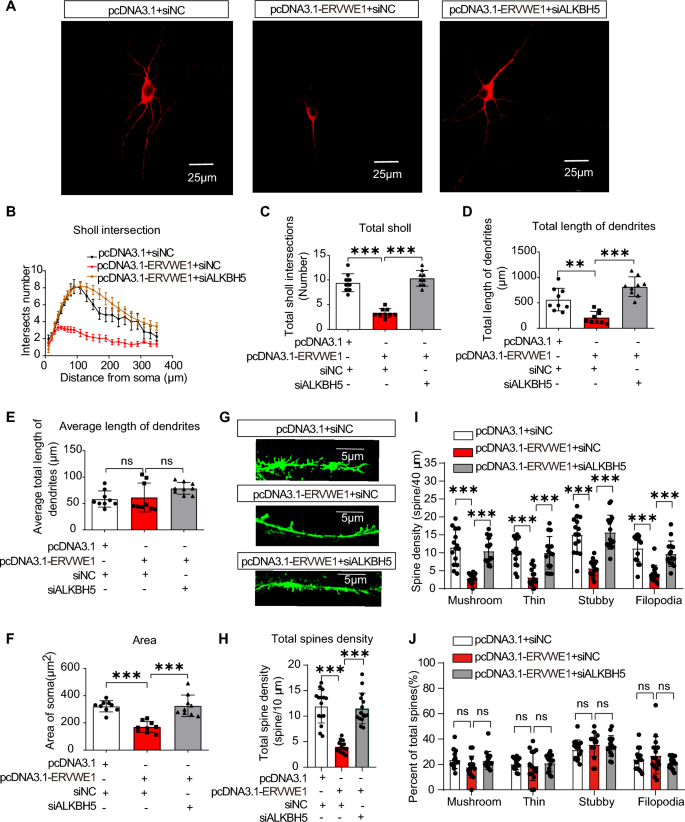 本环节实验目的为验证ALKBH5在ERVWE1诱导的5-HT神经元可塑性损伤中的介导作用。研究在DRN神经元中转染ERVWE1过表达质粒或联合转染ALKBH5 siRNA,采用免疫荧光检测Arc的表达,通过Sholl分析、树突棘计数评估神经元可塑性。结果显示,敲低ALKBH5可逆转ERVWE1诱导的Arc表达上调,同时恢复神经元的树突复杂性与树突棘密度,表明ALKBH5是ERVWE1调控5-HT神经元可塑性的关键介导因子。