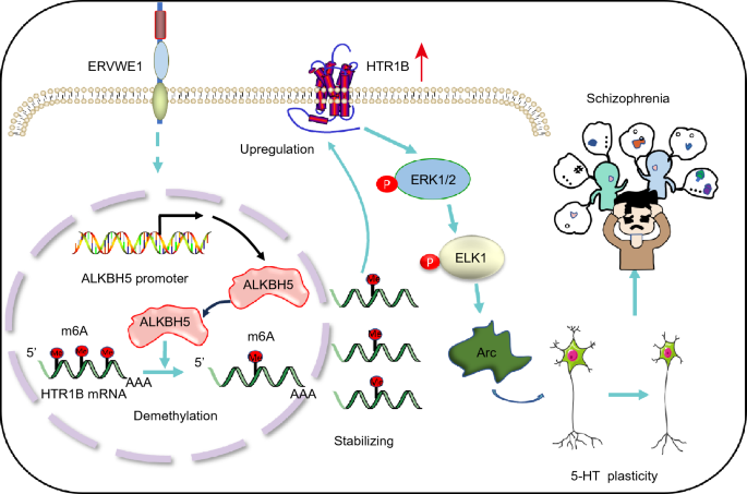 本研究的创新价值在于,首次揭示ERVWE1通过ALKBH5-m6A依赖的表观遗传途径激活HTR1B-ERK-ELK1-Arc通路,导致5-HT神经元可塑性损伤,填补了ERVWE1调控精神分裂症突触可塑性的表观遗传机制空白;同时通过临床样本多因素分析,证实ALKBH5是精神分裂症的新风险基因,为精神分裂症的Biomarker筛选与治疗靶点开发提供了新方向。