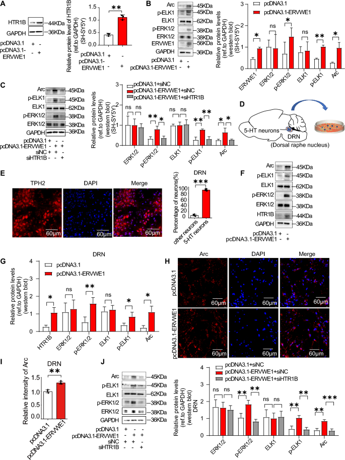 本环节实验目的为验证ERVWE1对HTR1B及下游ERK通路的调控作用。研究在人神经母细胞瘤细胞系SH-SY5Y中转染ERVWE1过表达质粒或HTR1B特异性siRNA,采用蛋白质免疫印迹(Western Blot)检测蛋白表达;分离新生SD大鼠中缝背核(DRN)神经元(经免疫荧光验证含90%以上5-HT神经元),转染ERVWE1质粒后检测相关蛋白表达。结果显示,ERVWE1过表达显著上调SH-SY5Y细胞中HTR1B、磷酸化ERK1/2(p-ERK1/2)、磷酸化ELK1(p-ELK1)、Arc的蛋白水平;敲低HTR1B可完全逆转ERVWE1对下游通路的激活作用;DRN神经元中ERVWE1过表达同样上调上述蛋白水平,免疫荧光染色显示Arc的荧光强度显著增强。