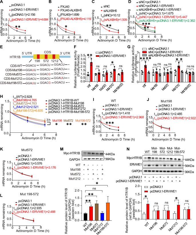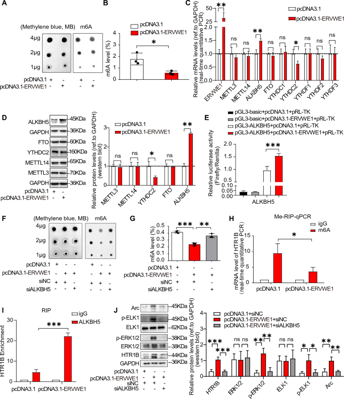 本环节实验目的为明确ERVWE1是否通过ALKBH5介导的m6A修饰调控HTR1B的mRNA稳定性与表达。研究在SH-SY5Y细胞中转染ERVWE1过表达质粒或ALKBH5 siRNA,采用dot blot、RNA甲基化定量试剂盒检测全局m6A水平;通过甲基化RNA免疫沉淀-qPCR(Me-RIP-qPCR)检测HTR1B mRNA的m6A修饰水平;利用放线菌素D处理阻断RNA合成,检测HTR1B mRNA的稳定性;通过双荧光素酶报告实验验证HTR1B编码区(CDS)的m6A修饰位点功能。结果显示,ERVWE1过表达显著降低细胞全局m6A水平,同时上调ALKBH5的mRNA与蛋白表达;敲低ALKBH5可逆转ERVWE1诱导的m6A水平降低与HTR1B上调;Me-RIP-qPCR显示ERVWE1降低HTR1B mRNA的m6A修饰水平,增强其mRNA稳定性;双荧光素酶实验证实HTR1B CDS区的198、572位点为关键m6A修饰位点,ERVWE1通过ALKBH5介导的去甲基化增强HTR1B的表达。