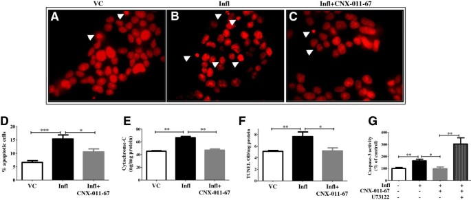 实验目的是验证GPR40激活对炎症诱导的β细胞凋亡的保护作用。方法细节为NIT1细胞和大鼠胰岛经处理后,通过核碎裂实验(碘化丙啶染色)、细胞色素c ELISA、TUNEL实验、Caspase-3活性检测多维度评估凋亡水平。结果解读:炎症组凋亡核比例从6.6%升至15.4%(n=4,P<0.001),细胞色素c水平、TUNEL阳性率、Caspase-3活性均显著升高;GPR40激活后凋亡核比例降至10.5%(n=4,P<0.05),其余凋亡指标也显著降低,且该保护作用被PLC抑制剂U73122逆转,说明GPR40激活可特异性抑制炎症诱导的β细胞凋亡。产品关联:实验所用关键产品:Invitrogen的Caspase-3底物Ac-DEVD-R110,Millipore的ApopTag® Peroxidase Apoptosis Detection Kit。