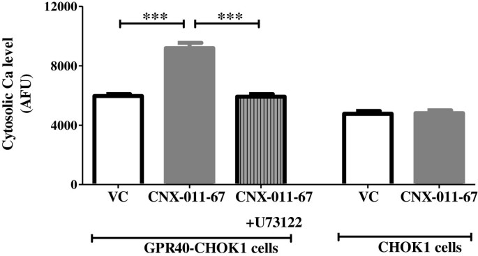 实验目的是确认CNX-011-67作为GPR40激动剂的特异性及信号通路依赖性。方法细节为采用过表达小鼠GPR40的CHOK1细胞与正常CHOK1细胞,给予1μM CNX-011-67处理,同时用PLC抑制剂U73122预处理,通过Fluo-4-AM荧光探针检测细胞质钙通量变化。结果解读:过表达GPR40的细胞中钙通量显著升高(9187 AFU vs 对照组5967 AFU,n=4,P<0.001),U73122处理后钙通量降至5921 AFU,正常CHOK1细胞无显著变化,说明CNX-011-67可特异性激活GPR40且依赖PLC通路。产品关联:文献未提及具体实验产品,领域常规使用钙荧光探针(如Fluo-4-AM)、PLC抑制剂等试剂。