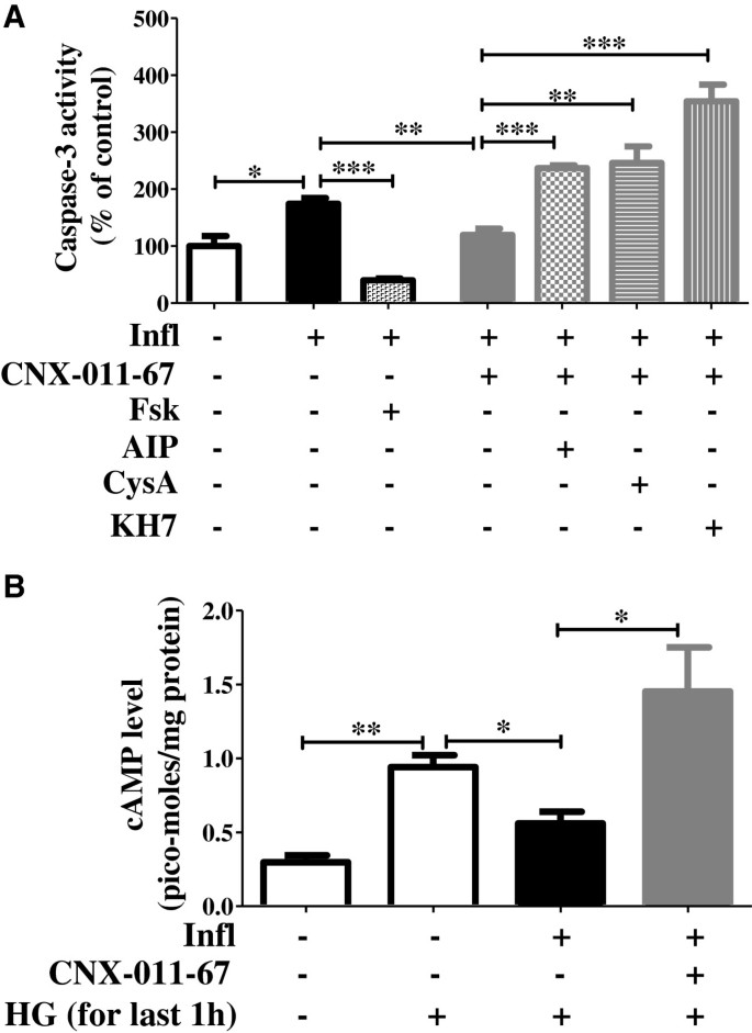 实验目的是解析GPR40激活抑制β细胞凋亡的下游信号通路。方法细节为用CaMKII抑制剂AIP、钙调磷酸酶抑制剂环孢素A、可溶性腺苷酸环化酶(ADCY)抑制剂KH7预处理NIT1细胞,检测Caspase-3活性变化;同时采用酶联免疫法检测细胞内cAMP水平。结果解读:GPR40激活使Caspase-3活性从炎症组的174%降至120%(n=4,P<0.01),抑制CaMKII或钙调磷酸酶后活性升至237%和246%,抑制ADCY后升至354%;炎症组高糖刺激下的cAMP水平从0.94pmol/mg蛋白降至0.56pmol/mg蛋白,GPR40激活后恢复至1.45pmol/mg蛋白(n=4,P<0.001),说明GPR40通过CaMKII-钙调磷酸酶-cAMP通路抑制β细胞凋亡。产品关联:文献未提及具体实验产品,领域常规使用信号通路抑制剂、cAMP检测试剂盒等试剂。