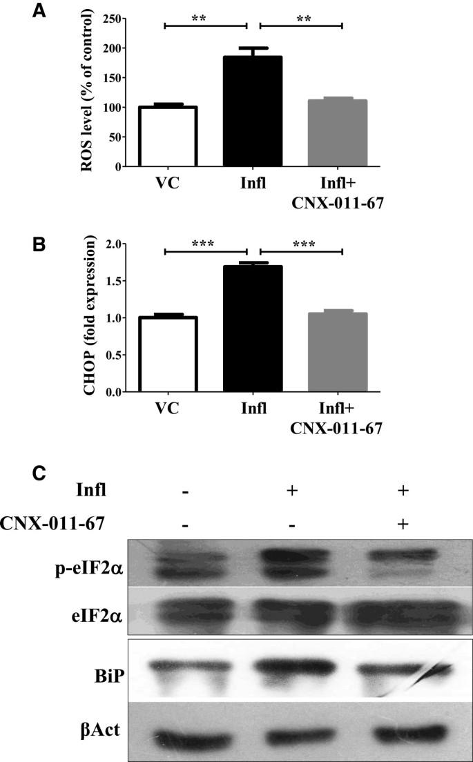 实验目的是检测GPR40激活对炎症诱导的氧化应激和内质网(ER)应激的调控作用。方法细节为NIT1细胞经炎症和GPR40激活处理72h后,用DCF荧光检测ROS水平,qRT-PCR检测CHOP基因表达,WB检测BiP和eIF2α磷酸化水平。结果解读:炎症组ROS水平升高1.8倍(n=4,P<0.01),CHOP基因表达上调1.6倍,BiP水平和eIF2α磷酸化分别升高1.4和1.2倍;GPR40激活后ROS水平恢复至正常,CHOP基因表达降至0.6倍,BiP水平和eIF2α磷酸化分别降至0.6和0.7倍,说明GPR40激活可显著降低炎症诱导的氧化应激与内质网应激。产品关联:文献未提及具体实验产品,领域常规使用DCFH-DA荧光探针、ER应激相关抗体等试剂。