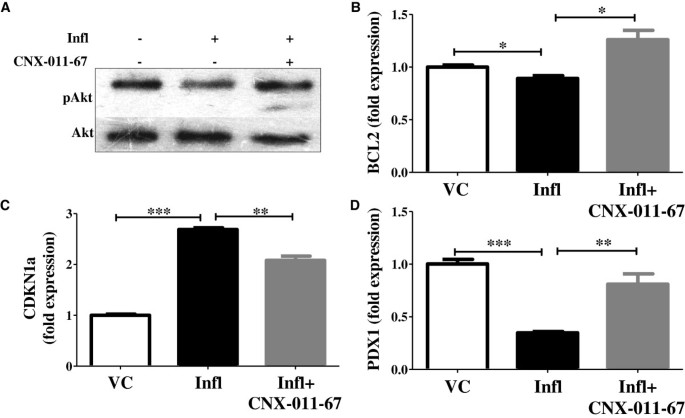 实验目的是检测GPR40激活对β细胞存活相关信号通路的调控作用。方法细节为通过WB检测Akt磷酸化水平,qRT-PCR检测BCL2、CDKN1a、PDX1基因表达。结果解读:炎症组Akt磷酸化降至对照组的0.54倍,BCL2和PDX1表达分别降至0.89和0.35倍,CDKN1a表达升至2.7倍(n=4,P<0.05或P<0.01);GPR40激活后Akt磷酸化升至1.51倍,BCL2和PDX1表达分别升至1.26和0.81倍,CDKN1a表达降至2.1倍,说明GPR40激活可增强β细胞存活信号,促进β细胞表型维持。产品关联:实验所用关键产品:Cell Signaling Technology的pAKT和AKT抗体。