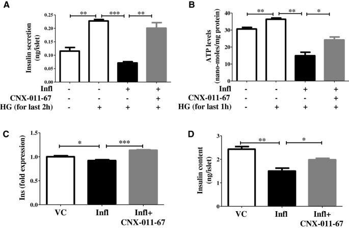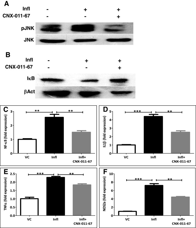 实验目的是验证GPR40激活对炎症信号通路的抑制作用。方法细节为用NIT1胰岛素瘤细胞和大鼠胰岛,给予TNFα和IL1β(各10ng/ml)处理72h构建慢性炎症模型,同时加入1μM CNX-011-67,通过蛋白质免疫印迹(WB)检测JNK磷酸化和IκB水平,qRT-PCR检测NF-κB、IL1β、TNFα、NOS2a基因表达。结果解读:炎症模型中JNK磷酸化升高4.4倍,IκB水平降低60%(n=4,P<0.001),NF-κB、IL1β、TNFα、NOS2a基因表达分别上调2.6、4.3、2.2、7.2倍(n=4,P<0.01或P<0.001);GPR40激活后JNK磷酸化降至1.5倍,IκB水平升至1.3倍,上述基因表达均显著降低,说明GPR40激活可有效抑制炎症信号通路的激活与促炎因子的表达。产品关联:实验所用关键产品:Cell Signaling Technology的pAKT、AKT、pJNK、JNK、IkB和β-actin抗体。