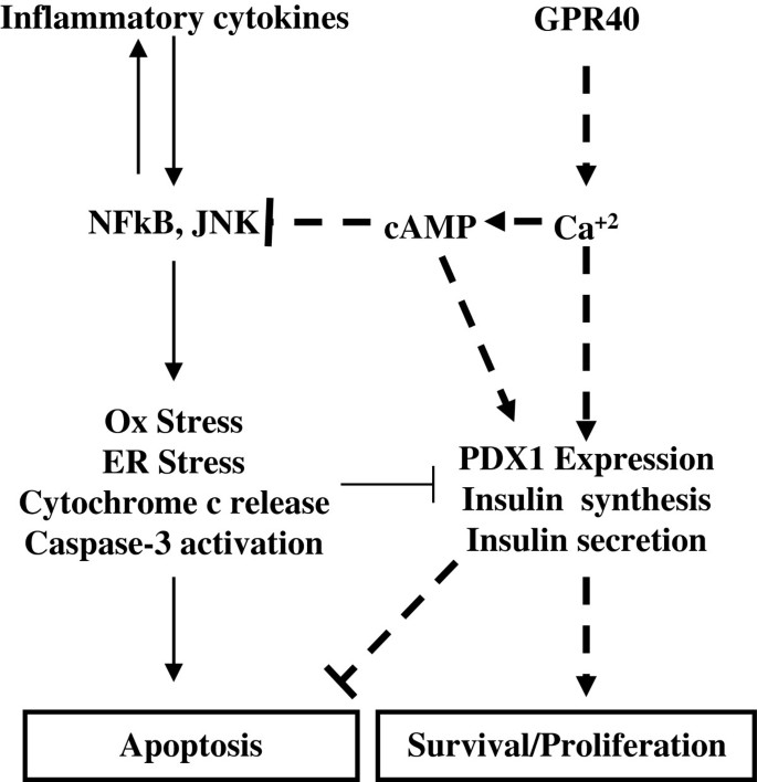 作者对领域内现有研究的分类维度为β细胞损伤机制(炎症应激、凋亡通路)与保护策略(如GLP-1类似物靶向治疗)两类。现有研究的关键结论包括:慢性炎症通过激活JNK、NFκB通路上调促炎因子表达,形成正反馈循环加重β细胞损伤;GLP-1类似物可通过提升cAMP水平抑制β细胞凋亡并促进胰岛素分泌。技术方法优势在于多采用细胞系与原代胰岛模型结合的方式,能较好模拟体内β细胞的生理环境;局限性则体现在GPR40相关研究多聚焦于胰岛素分泌调控,对其抗炎及抗凋亡的作用机制研究不足,缺乏系统的信号通路解析,且未明确GPR40激活与β细胞存活信号的直接关联。