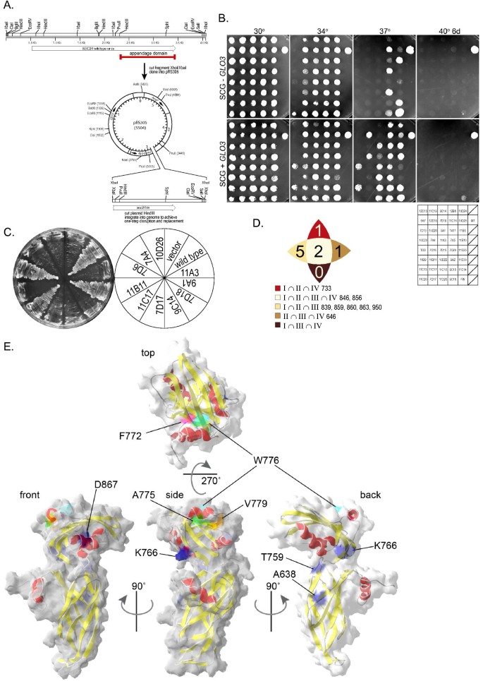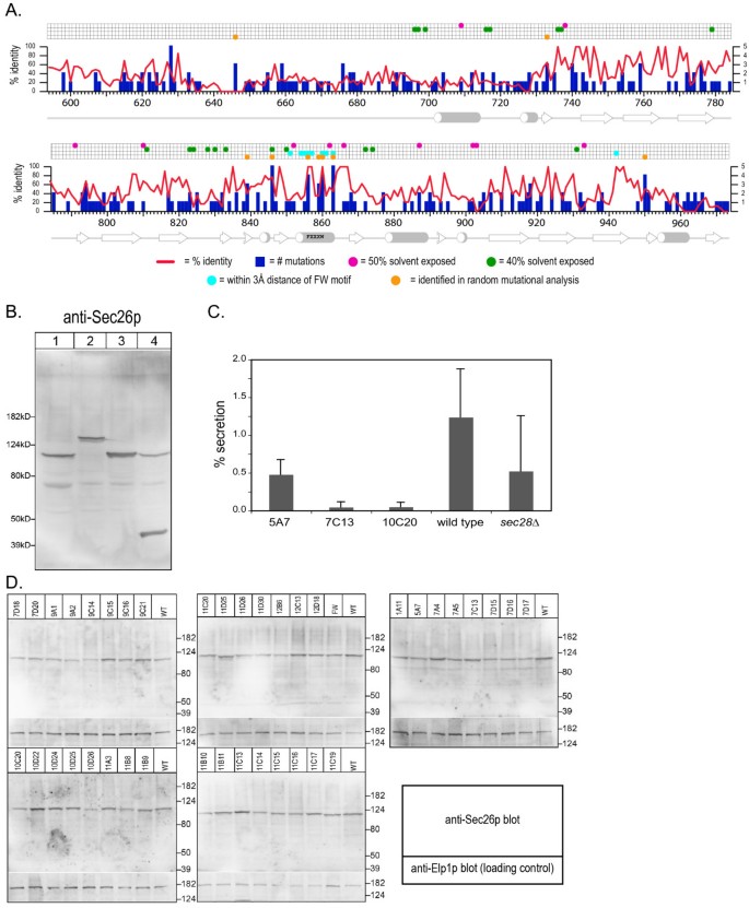 实验目的是通过随机突变筛选,鉴定附加结构域中对功能关键的氨基酸残基,明确结构与功能的关联。方法细节为通过易错PCR技术对Sec26p的附加结构域编码序列进行随机突变,将突变产物与线性化载体共转化至sec26Δ菌株,通过同源重组构建突变体质粒,筛选在30℃存活、37℃致死的温度敏感(ts)突变体;通过Western blotting检测突变体在 restrictive温度下的蛋白表达水平,排除蛋白降解导致的表型;通过转化酶分泌实验验证突变体的囊泡运输功能缺陷。结果解读:共筛选得到38个独立的sec26ts突变体,测序结果显示这些突变体包含276个突变位点,分布于181个氨基酸残基;Western blotting结果显示,所有突变体在40℃处理1小时后的蛋白表达水平与野生型无显著差异(n=3,P>0.05),表明温度敏感表型由蛋白功能缺陷而非降解导致;转化酶分泌实验显示,突变体在40℃下的转化酶分泌率仅为野生型的30%-50%(n=3,P<0.01),证明其COPI介导的逆向运输功能受损。
